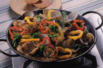 - 在锅里面往上橄榄油,烧执热后先把蒜放入锅里炒,再加入花甲和西兰花一起炒,放上盐,胡椒。炒到花甲开口,倒入白葡萄酒1匙。