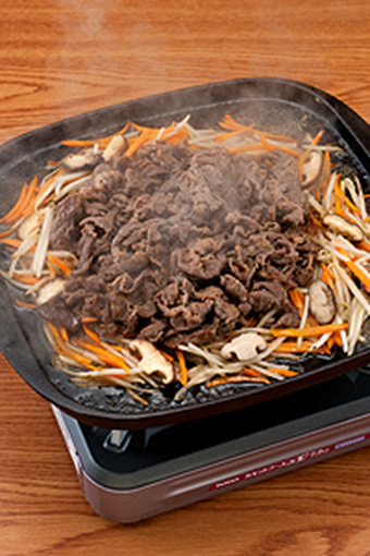 • 把我们喜爱的烤肉盘用大火加热,倒入芝麻油调和味道。将腌制好的牛肉倒入盘中翻炒,待肉的颜色变深,煮出汁后,再将步骤1的蔬菜倒入一齐翻炒即可。