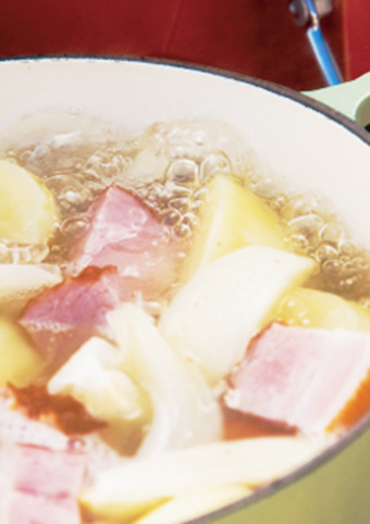 可用香肠和金枪鱼代替腊肉,会有不一样的风味哦。土豆吸收了清汤的香味,而洋葱的甜味渗透每一个味蕾,请尽情享用吧。